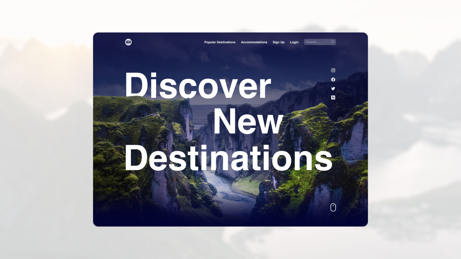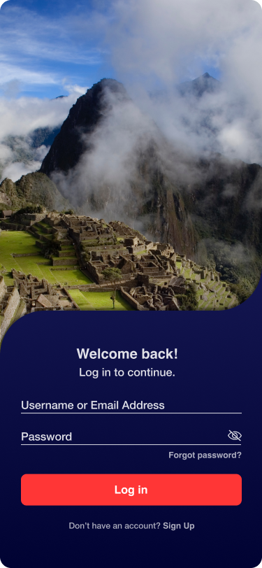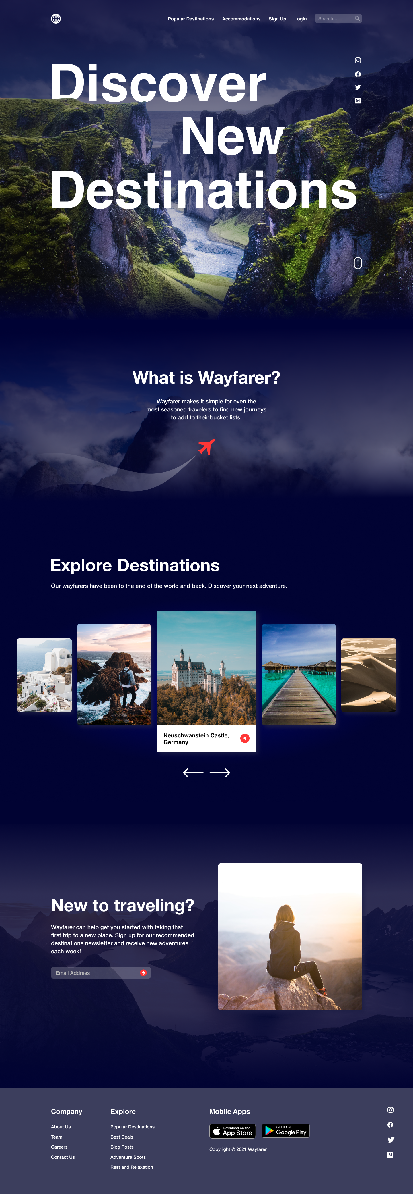 I wanted the user to immediately be immersed in a picturesque landscape upon visiting the Wayfarer site, to encourage wanderlust. I used a parallax effect in the hero to create depth, and a bouncing mouse icon to indicate the user should scroll the length of the page. Throughout the site I included small animations that wouldn’t hinder load time too much, but would add interesting details and character. For the “Explore Destinations” section, I felt imagery of travel destinations would be most enticing for users to want to view more, and then location next most important. The carousel feature also previews multiple destinations at once so the user will have many possible options that they would want to explore. At the end, I include the call to action to sign up for newsletters, and links for both Apple and Android devices to download the mobile app.