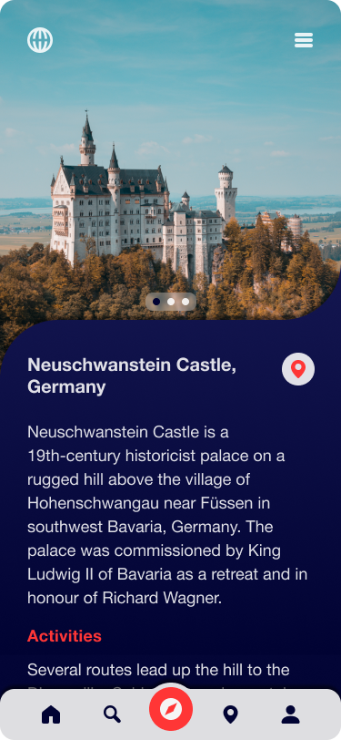 In the mobile app design, I organized content to feel like there was plenty of breathing room for everything, while also having plenty of enticing imagery. “Most pinned locations” would likely be most interesting for users upon visiting the app, so they could quickly see destinations they would like to try. It is then followed by a breakdown of environment types to categorize what kind of destination the user may want to visit. In the location details page, I included a section at the top to view more images of a location, a short description, and then there would be listed activities you could do in the area.