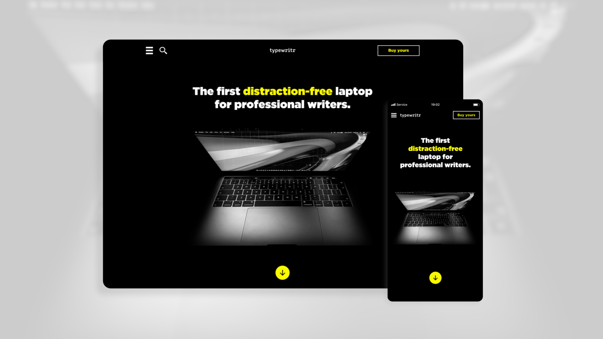 This was a practice in responsive design. I kept the use of the yellow brand color low, and only to accent key details I wanted the user to notice. The clear call to action in the top right corner would remain at the top as you scroll down the site. I kept the navigation in a collapsed menu in the top left, with the belief that users may be visiting primarily on a mobile device, since they are looking to buy a computer. The would need to be further researched to see if this hypothesis is accurate, and if it is not, then on the desktop view, we could expand the navigation at the top to feature most useful site links for users.